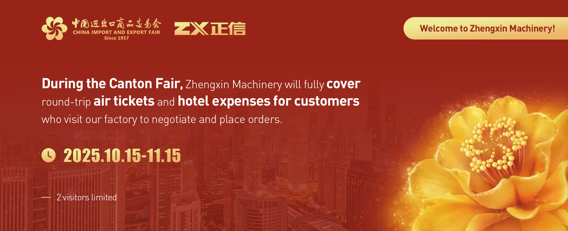 Во время Кантонской ярмарки компания Zhengxin Machinery полностью оплатит авиабилеты туда и обратно, а также проживание в отеле для клиентов, посещающих наш завод для переговоров и размещения заказов. Добро пожаловать в Zhengxin Machinery! (Ограничение: два человека).